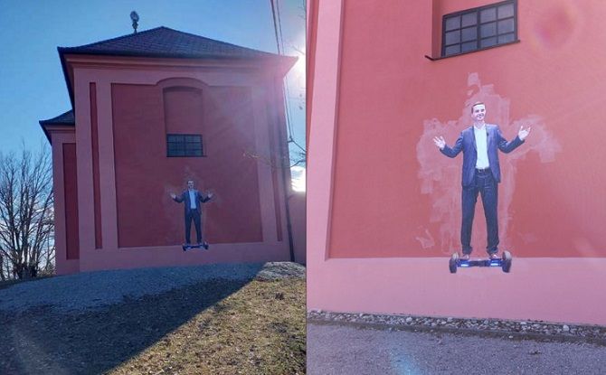Današnja žrtev mazaške akcije je nedavno obnovljena cerkev na Rožniku, na katero so neznanci nalepili podobo predsednika NSi in obrambnega ministra Mateja Tonina.