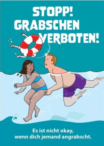 Plakat na zunanjem bazenu v Bürenu v Severnem Porenju-Vestfaliji tako denimo prikazuje močnejšo rdečelaso žensko, ki otipava zadnjico temnopoltega fanta s protezo. Nad risbo sta napisa »Zaščita pred poletnim soncem« in »Stop! Brez otipavanja.«