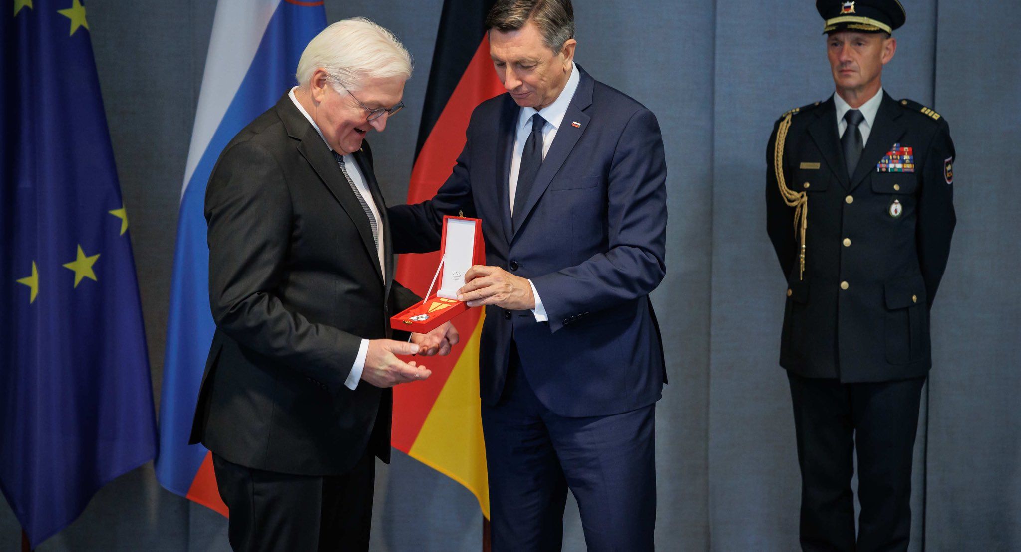 Predsednik države Borut Pahor je v okviru uradnega obiska v Nemčiji svojemu nemškemu kolegu Franku-Walterju Steinmeierju podelil najvišje državno odlikovanje za osebne zasluge za poglobitev vsestranskih odnosov med Slovenijo in Nemčijo.