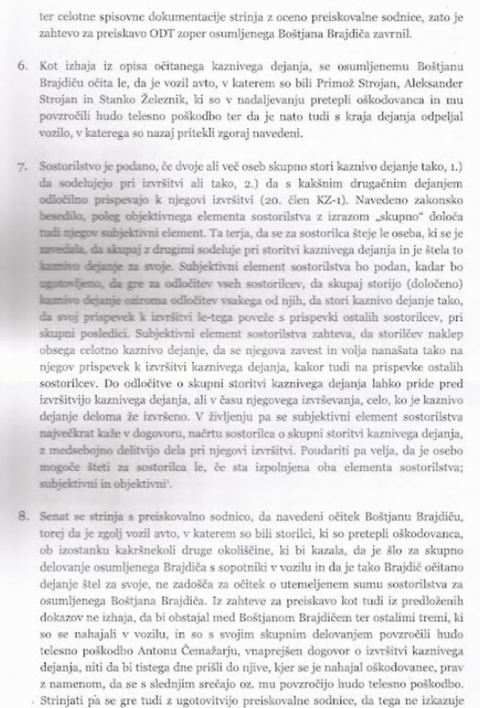 Zato v sodbi zaključuje, da glede na vse navedeno kaznivega dejanja, kot je le to opisano, ni mogoče očitati, saj tudi po oceni senata v opisu kaznivega dejanja očitek o odločilnem prispevku osumljenega Boštjana Brajdiča ni dovolj konkretiziran, poleg tega pa tudi iz predloženih dokazov ne izhaja, da je imenovani izvršil očitano kaznivo dejanje oziroma da je odločilno prispeval k povzročitvi hude telesne poškodbe oškodovancu Antonu Čemažarju, »še manj pa, da je dejanje štel za svoje«.