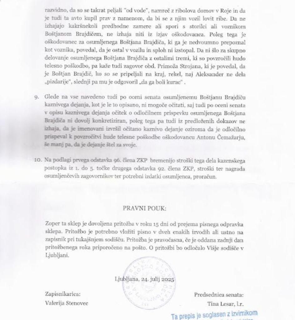 Brajdiču v prid je šlo, sklepajoč na obrazložitev sodbe, tudi pričanje nesrečnega 70-letnega ljubljanskega kmeta. »Poleg tega je oškodovanec za osumljenega, ki ga je nedvoumno prepoznal kot voznika, povedal, da je ostal vozilu in sploh ni izstopal. Da ni šlo za skupno delovanje osumljenega Boštjana Brajdiča z ostalimi tremi, ki so povzročili hudo telesno poškodbo, pa kaže tudi zagovor obdolženega Primoža Strojana, ki je povedal, da je Boštjan Brajdič, ko so se pripeljali na kraj, rekel, naj Aleksander ne dela »pi*darije«, slednji pa je odgovoril, da ga »boli k*rac,« še lahko preberemo v sodbi. Zoper bizarni sklep Tine Lesar ima odvetnik Čemažarjevih Klemen Golob v 15 dneh možnost pritožbe, kar naj bi po naših informacijah tudi storil.