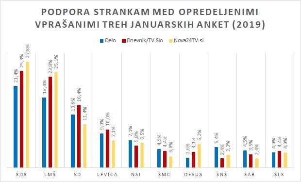 V primerjavi podpore strankam med opredeljenimi volivci treh januarskih anket - Medianine za Delo, Parsifalove za Nova24TV.si in ankete Ninamedie prihaja do precejšnjih razlik: