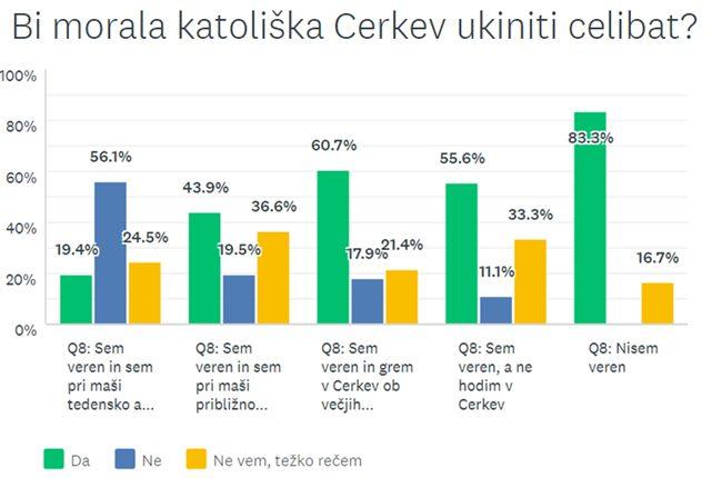 Da bi katoliška Cerkev morala ukiniti celibat meni zgolj petina nedeljnikov, 44 % mesečnih obiskovalcev cerkve, 60 % tistih, ki prihajajo za večje praznike, 55 % vernih, ki v cerkev ne hodijo in 83 % nevernih.