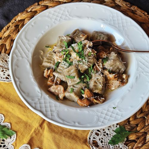 Količina: za 4 osebe Zahtevnost: Enostavno Čas priprave: 60 minut Sestavineza njoke: 500 g krompirja rumene sorte 230–250 g ajdove moke 1 jajce 1 jušna žlica olja sol Za omako: 1 šalotka 250 g zamrznjenih jurčkov sol poper olje svež...