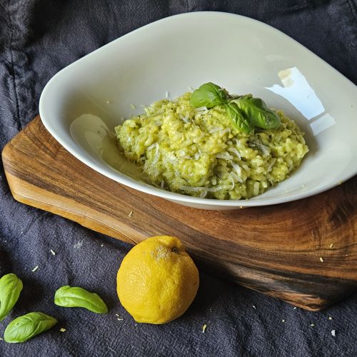 Količina: za 2 osebi Zahtevnost: Enostavno Čas priprave: 35 minut Sestavine 2 bučki (pribl. 250 g) 200 g riža 1 strok česna 1 manjša čebula 300 ml zelenjavne jušne osnove 50 g ribanega parmezana in nekaj parmezana za dodatek h...