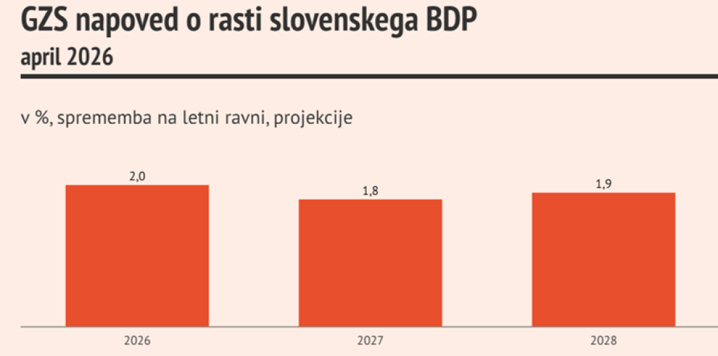 Najnovejša pomladanska napoved Gospodarske zbornice Slovenije razkriva manj optimistično sliko slovenskega gospodarstva. Ocena rasti BDP za leto 2026 je bila znižana na 2,0 odstotka, medtem ko se inflacija zvišuje na približno 3,1 odstotka. Gre za kombinacijo, ki kaže na upočasnjevanje gospodarske dinamike ob hkratnem naraščanju stroškov.