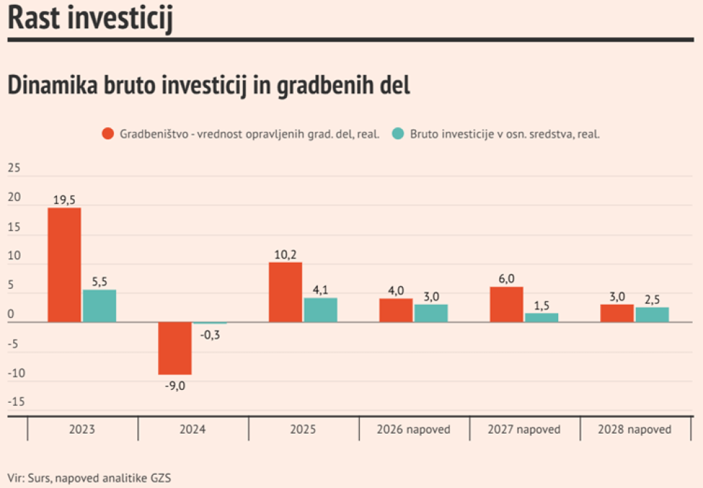 Rast investicij v letu 2026 izhaja predvsem iz preteklih odločitev, zlasti v gradbeništvu. Vendar pa negotovosti v dobavnih verigah in naročilih že vplivajo na prihodnje načrte. Za leto 2027 se napoveduje upočasnitev rasti na 1,8 odstotka. Na poslabšanje vplivajo tudi domači dejavniki, kot sta rast minimalne plače in dodatni stroški dela.