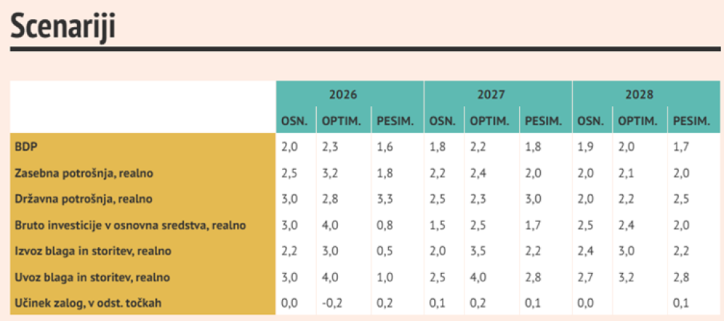 Napoved vključuje tudi alternativne scenarije. V optimističnem primeru bi se razmere na energetskih trgih hitro izboljšale, v pesimističnem pa bi cena nafte dosegla tudi 110 dolarjev na sod. Temu ustrezno se rast BDP v prihodnjih letih giblje v razponu med 1,7 in 2,2 odstotka.