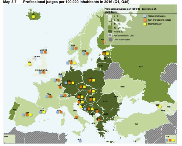 Na 100.000 prebivalcev imamo v Sloveniji 43 sodnikov, kar je skoraj še enkrat več od evropskega povprečja. Smo pa to število od leta 2010, ko je bilo sodnikov 50, občutno zmanjšali. Največ, kar 99 sodnikov na 100.000 prebivalcev, imajo v Monaku. Najmanj, samo po 3 pa v Angliji, Walesu, na Škotskem in na Irskem.