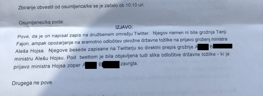Tokrat se nakazuje nekoliko drugačna obravnava grožnje. Provokatorja je že zaslišala policija. V podani izjavi je potegavščino priznal in obrazložil, kar je razvidno tudi iz zapisnika, ki ga je objavil na Twitterju.