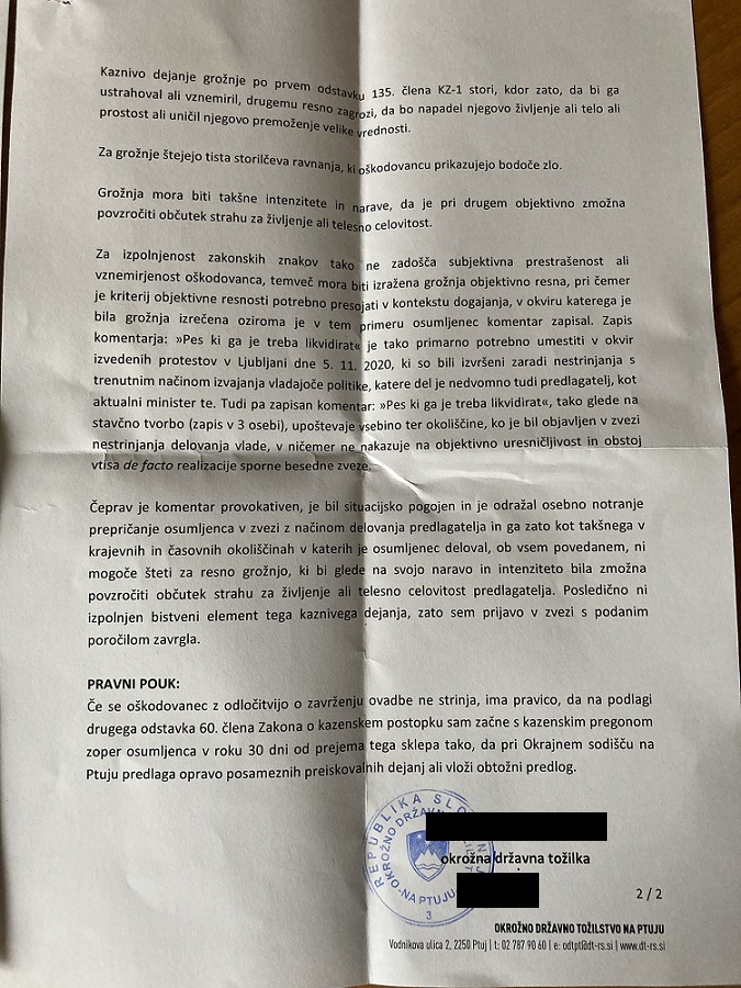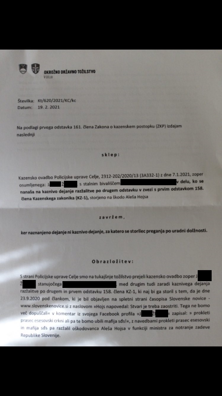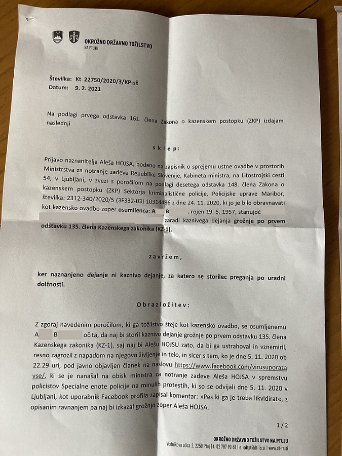 9. februarja je tožilka zavrgla prijavo ministra za notranje zadeve Aleša Hojsa, ki je prijavil uporabnika omrežja Facebook A.B. zaradi grožnje, ki jo je zapisal v komentarju pod objavo članka na omenjenem družbenem omrežju. Članek se je nanašal na Hojsov obisk nasilnih protestov, ki so se v Ljubljani odvijali 5. novembra lani, minister pa si je kraj dogodka ogledal v spremstvu policistov.