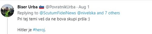 V neki nepomembni tviter razpravi je neki tviteraš zapisal, da je Hitler #heroj. Zadeva bi verjetno šla mimo in morda pritegnila pozornost le kakšnega policijskega obveščevalca, ki se ukvarja z ekstremističnimi skupinami v družbi, če avtor zapisa, 31-letni Urban Purgar, ne bi bil član tako imenovanih rumenih jopičev, predsednik Društva za promocijo tradicionalnih vrednot ter odgovorni urednik medija, ki se je poimenoval Slovenska nacionalna agencija.