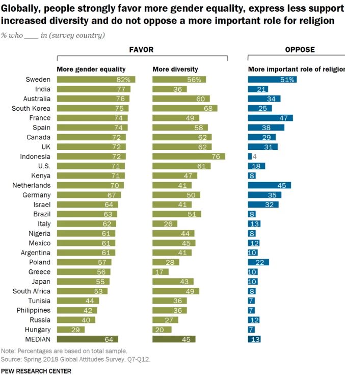 Če glede spolne enakopravnosti ni dileme in večina vprašanih v 27 državah verjame, da se je enakopravnost med spoloma v zadnjih dveh desetletjih povišala in jim je to tudi po godu, pa so glede ostalih vprašanj razlike med pripadniki različnih skupnosti in civilizacijskih krogov precejšnje.
