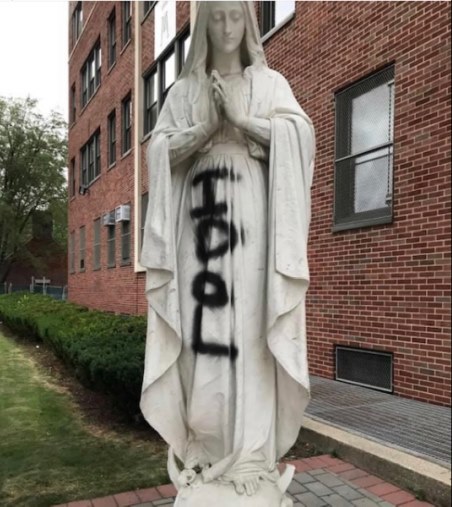 Minuli vikend, ko sta bili požgani dve katoliški cerkvi, pa sta bila v Bostonu in New Yorku oskrunjena tudi kipa device Marije. Enega, pred cerkvijo sv. Petra v istoimenski bostonski župniji so prav tako zažgali, drugega v Queensu pa popisali s črnim sprejem.