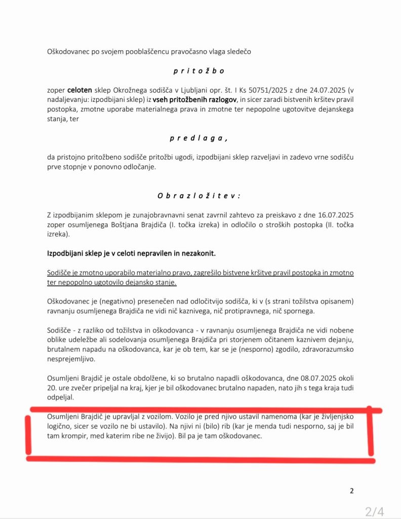 »To je zdravorazumsko nesprejemljivo,« piše v pritožbi odvetnik Klemen Golob. »Osumljeni Klemen Brajdič je ostale obdolžene, ki so brutalno pretepli oškodovanca, dne 8. 7. 2025 okoli 20. ure zvečer pripeljal na kraj, kjer je bil oškodovanec brutalno napaden, nato pa jih je s kraja tudi odpeljal. Osumljeni Brajdič je upravljal z vozilom. Vozilo je pred njivo ustavil namenoma, kar je življenjsko logično, sicer se vozilo ne bi ustavilo. Na njivi ni bilo rib, kar je menda tudi nesporno, saj je bil tam krompir, med katerim ribe ne živijo. Bil pa je tam oškodovanec. Oškodovanec se nikakor ne strinja z zaključki sodišča, da pri ravnanju osumljenega Brajdiča ni šlo za skupno delovanje z ostalimi tremi obdolženimi. Brez dvoma je šlo za skupno, vnaprej načrtovano, dogovorjeno ravnanje vseh štirih obdolžencev osumljencev,« piše v pritožbi na ljubljansko višje sodišče.
