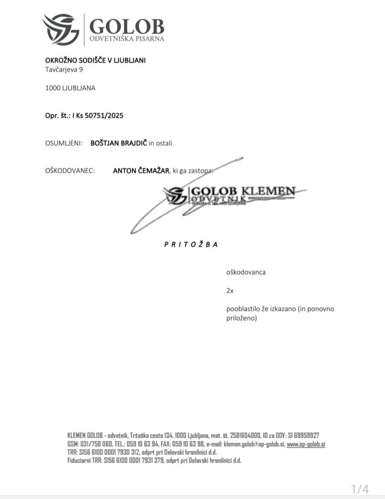 Čemažarjev odvetnik Klemen Golob je vložil pritožbo zoper celoten sklep okrožnega sodišča v Ljubljani z dne 24. julija letos, ko je zunajobravnavni senat zavrnil zahtevo za sodno preiskavo osumljenca Boštjana Brajdiča. Kot je razvidno iz sodnega spisa, ki smo ga pridobili v uredništvu, sodišču oškodovanec očita bistvene kršitve pravil postopka, zmotno uporabo materialnega prava in zmotno ter nepopolno ugotovitev dejanskega stanja.
