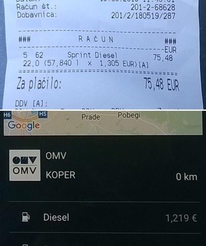 Ponovno sem aplikacijo preizkusil še v Kopru. Odpravljal sem se v Ankaran in aplikacija mi je sporočila, da je v Slovenski Istri najcenejše gorivo na črpalki OMV na izvozu avtoceste na Bivju (ob stari cesti med Bertoki in Dekani). Cena za liter je bila 1,219 evra. Najdražje gorivo pa je bilo na isti firmi, na črpalki OMV na avtocesti (self) nekaj kilometrov prej. Cena je bila 1,305 evra.