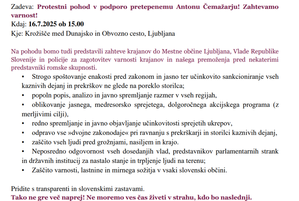 V uredništvo smo prejeli obvestilo, da Civilna iniciativa »Zahtevamo varnost!« pripravlja protestni pohod v podporo pretepenemu Antonu Čemažarju. Gre za pohod zaradi neučinkovitosti državnih institucij pri problematiki z Romi. Pohod bo v Ljubljani, 16. 7. 2025, ob 15.00.