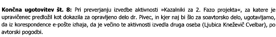 Pivčeve resda ni med tremi ovadenimi, a v omenjenem poročilu glede njenega »prispevka« vsaj za slabe 4 tisočake nedvoumno piše, da »poročila, ki jih je avtorica priložila za zgoraj opravljeno delo po avtorski pogodbi, ne vsebujejo zgoraj omenjenih strokovnih podlag, metodologij ali podobnih gradiv, ki bi dokazovala nastanek avtorskega dela« ...