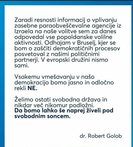 Medtem ko je sekretar za nacionalno in mednarodno varnost v kabinetu predsednika vlade Vojko Volk na današnji novinarski konferenci ocenil, da tuje vmešavanje na nedeljske volitve kljub vsemu po vsej verjetnosti ne bo vplivalo, je predsednik vlade Robert Golob zadevo vzel precej bolj resno. »Zaradi resnosti informacij o vplivanju zasebne paraobveščevalne agencije iz Izraela na naše volitve, sem za danes odpovedal vse popoldanske volilne aktivnosti,« je sporočil in pojasnil, da odhaja v Bruselj, kjer se bo o zaščiti demokratičnih procesov posvetoval s političnimi parnerji. »Da bomo lahko še naprej živeli pod svobodnim soncem,« je še zapisal.