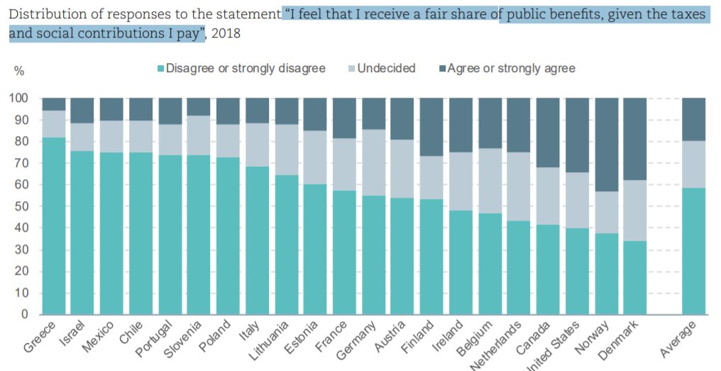 Občutek med Slovenci, da glede na plačane davke od države v obliki socialnih in družbenih benefitov dobijo premalo oziroma da so jih bolj kot oni sami, deležni drugi, je po nedavni raziskavi OECD-ja eden najvišjih v Evropi.