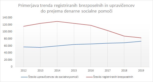 Čeprav bi pričakovali, da se z nižanjem števila registriranih brezposelnost znižuje tudi število upravičencev do prejemanja denarne socialne pomoči, pa graf prikazuje ravno nasprotno situacijo (vir: MDDSZ in Zavod za zaposlovanje)