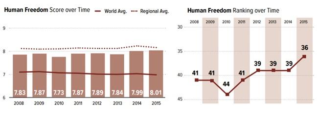 Največje spremembe na slabše je od leta 2008 do 2014 doživelo področje vladavine prava in svobode gibanja, izboljšalo pa se je področje svobode združevanja. Ostala področja ostajajo primerljiva.