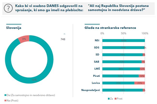 Da je samostojna in neodvisna država edina prava izbira za slovenski narod, danes, 30 let kasneje, ni prav nobenega dvoma za volivce NSi in SDS. Nekaj skeptikov, ki bi glasovali proti osamosvojitvi, pa se že najde pri strankah leve opozicije - še najmanj, zanimivo - pri volivcih SD-ja, kar precej pri volivcih LMŠ-ja, kar četrtinski delež pa med volivci Levice.