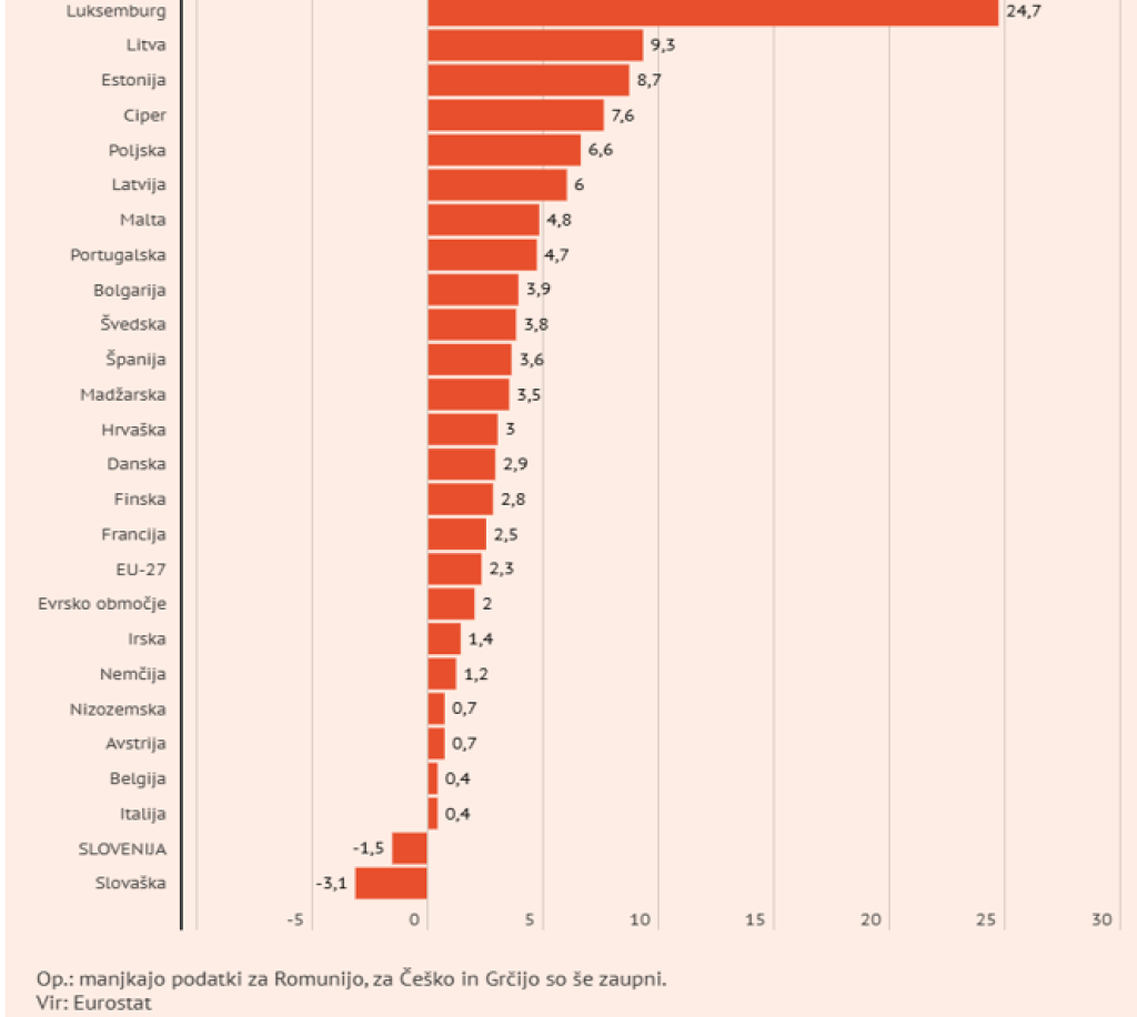 Na drugem mestu je Litva z 9,3-odstotno rastjo, sledil pa ji je Ciper, kjer je bila rast 7,6-odstotna.