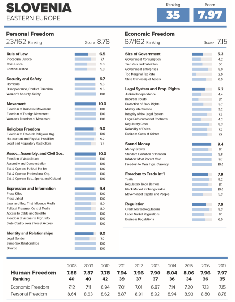 Če upoštevamo neustavnost in nedemokratičnost sorazmernega volilnega sistema v RS, po katerem nam stranke avtokratsko vsiljujejo strankokracijo zvestih strankarskih aparatčikov in naglušnih hujskačev v parlament in vlado ter če vemo, da je sodna veja oblasti zaradi trajnih mandatov ostala nedotaknjena od časov socialističnega enoumja in enopartijske diktature, potem je položaj Slovenije na lestvici človekove svobode še dokaj visok in zavidljiv.
