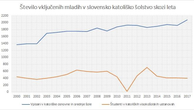 Število vključenih mladih v slovensko katoliško šolstvo skozi leta (vir: Letno poročilo RKC) (klik za povečavo)