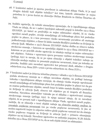 Decembra smo pisali, da sodni mlini na levem bregu Savinje meljejo počasi – po tem, ko je upravno sodišče sredi oktobra odpravilo vladni sklep o rušitvi objektov na desnem bregu Savinje v Letušu, so na levem bregu pričakovali, da bodo v kratkem tudi oni prejeli odločitev. A ker se v naslednjih dveh mesecih to ni zgodilo, so na sodišče poslali urgenco. Kot nam je takrat povedal Bojan Arčan, so seveda pričakovali enako odločitev kot je bila izrečena že za desni breg – da država nima nobene pravne osnove, da bi stanovalce lahko prisilno selila. Glede na to, da gre za identično dejansko in pravno stanje in da so razlogi vrhovnega sodišča v obeh zadevah (desni in levi breg) identični, tožečim strankam ni bilo jasno, zakaj naslovno sodišče v njihovi zadevi še ni odločilo. »V obravnavanem primeru gre za očitno kršitev postopkovnih pravic stranke, ki ji je zagotovljeno sodno varstvo in pravica do sojenja v razumnem roku,« so bili prepričani tožniki.