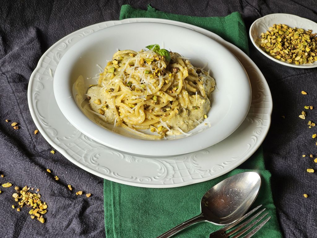 - Špagete zmešamo s pestom pistacije in burrate. Po potrebi dodamo še nekaj vode, v kateri so se kuhali špageti. Sestavine dobro premešamo, da se povežejo med seboj, in takoj postrežemo. Dodatno posujemo še nekaj grobo mlete pistacije, dodamo nariban parmezan ter listič sveže bazilike.