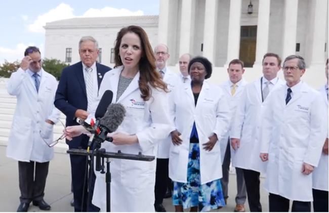Skupina ameriških zdravnikov je skupaj s kongresnikom Ralphom Nomanom iz Južne Karoline na nedavni novinarski konferenci v pred vrhovnim sodiščem v Washingtonu zagovarjala odprtje ameriških šol, opozarjala na javnozdravstvene posledice prekinitve javnega življenja in zagovarjala zdravljenje s hidroksiklorokinom, ki marsikje v ZDA državljanom ni dostopen. V videu je slišati tudi pozive o tem, da zaščitne maske v resnici ne ščitijo pred okužbo.