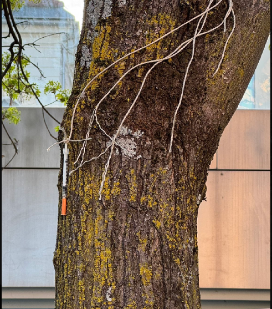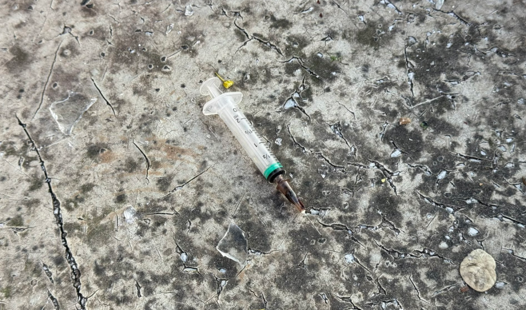 »Uporabljene, pogosto krvave igle in ostali pripomočki za uporabo drog ne ležijo več samo po tleh. Dobesedno visijo z dreves neposredno ob otroških igralih, kjer se vsakodnevno igrajo naši najmlajši,« v objavi na X opozarja uporabnik.