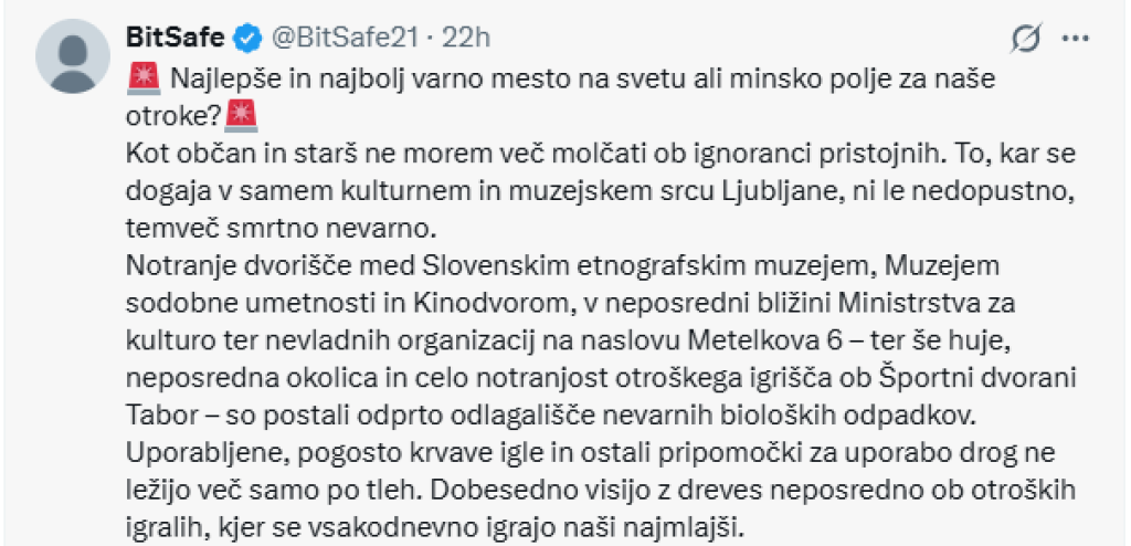 Kar se dogaja v samem kulturnem in muzejskem srcu Ljubljane, ni le nedopustno, temveč smrtno nevarno, v zapisu na omrežju X opozarja uporabnik BitSafe. Kot navaja, je notranje dvorišče med Slovenskim etnografskim muzejem in Muzejem sodobne umetnosti v neposredni bližini ministrstva za kulturo in nevladnih organizacij na Metelkovi 6 postalo odlagališče nevarnih bioloških odpadkov oziroma uporabljenih, pogosto krvavih igel, ki jih za seboj puščajo odvisniki. Podobno je tudi v neposredni okolici bližnjih otroških dvorišč. Zapisano uporabnik, ki se opiše kot občan in starš, podkrepi s številnimi fotografijami, nevarne razmere pa v množici komentarjev potrdijo tudi drugi uporabniki omrežja.
