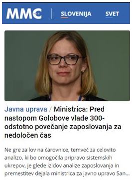 Na MMC so šli celo dlje in v naslovu objavili citat ministrice, da se je pred nastopom Golobove vlade zgodilo 300-odstotno povečanje zaposlovanja za nedoločen čas. A vsaj v prispevku navedejo absolutne številke, torej da se je število zaposlenih v času od 1.1. 2020 do 1.6. 2022 v državni upravi povečalo za 512, od tega 231 v policiji in vojski, v preostalih organih državne uprave pa 281.