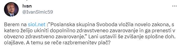 Malce spremljam odzive in ob tem, ko je nekaterim seveda dejstvo, da se omeji "požrtne" zavarovalnice všeč in jim je blizu progresivno zdravstveno osnovno zavarovanje (kar bo po vsej verjetnosti naslednji korak Golobove vlade), so pa številni tudi zelo proti, ker je bilo dodatno zdravstveno edino pavšalno enako zavarovanje za vse pri nas, brez progresije - nekaj kar je v Sloveniji tako priljubljeno (čeprav ljudje ne razumejo da le-te ni pri avtomobilskih zavarovanjih, ki si jih izbere vsak sam - razen z izjemo npr. vpliva karakteristik/moči vozila na višino zavarovanja; mi ne preračunavamo cen kruha, mleka, elektrike glede na posameznikovo plačo. Po fasn'go navsezadnje ne greš s svojo plačno listo :) ).