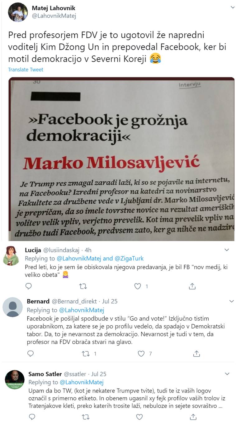 Pokomentiral bi še zapis, ki ste ga citirali od tviteraša 'Bernarda' zgoraj v 'printscreenu': Barack Obama je takrat leta 2008 dejansko zmagal z mobilizacijo preko spletnih omrežij, predvsem Facebooka. In to za medije ni bilo sporno, ampak se je po volitvah govorilo o t.i. 'grassroots movement', torej o nečem pozitivnem, emancipaciji volivcev itd. Donald Trump pa si je leta 2016 že v republikanskih soočenjih in kasneje v duelu s Hillary Clinton, prostor pod političnim soncem širil preko Twitterja. Vem, ker sem spremljal celotne repulikanske 'primaries' od prvih zborovanj oktobra 2015. In takrat se je o Trumpu govorilo samo na določenih bolj alter-forumih v Sloveniji, medtem ko g. Edvard Žitnik iz New Yorka še po obeh konvencijah demokratovi n republikancev ni imel pojma kaj se dogaja in kam se obračajo zadeve.
