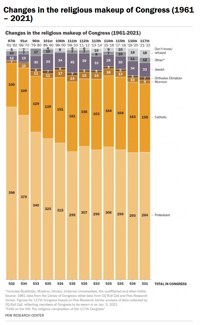 Medtem ko prebivalstvo ZDA iz leta v leto postaja manj krščansko, je delež krščansko usmerjenih kongresnikov v zadnjih sklicih presenetljivo stabilen. Med člani 87. sklica kongresa (sklic leta 1961), ki je prvi, odkar se je začelo beleženje podatkov, je bilo kar 95 % kristjanov. Rezultat se lepo ujema z rezultati Gallupovih raziskav, ki so delež v populaciji ocenile na 93 %.
