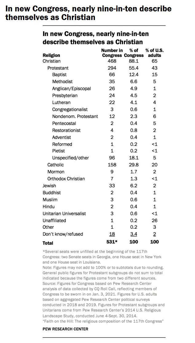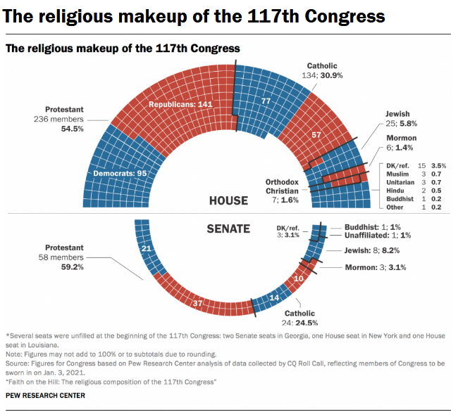 Verska sestava 117. kongresa v primerjavi s preteklimi sklici ni nič posebnega. Tudi v tem sklicu, kljub zmagi demokratov v obeh domovih kongresa (z dvema zmagama v drugem krogu v Georgii so včeraj osvojili tudi senat), z le malo spremenjenimi razmerji prevladujejo kristjani, med katerimi je največ protestantov in katolikov. Toda v primerjavi z ameriško družbo se vendarle kažejo nekatere pomembne razlike, ki tem trendom ne sledijo popolnoma.