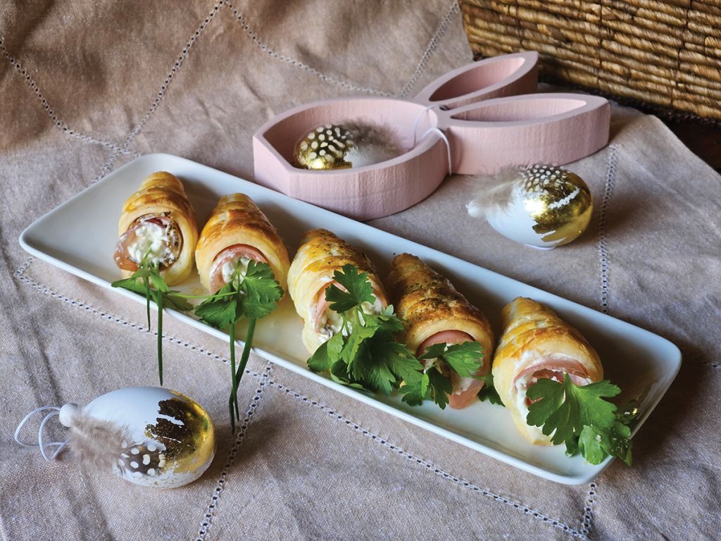 - Ko so stožci iz listnatega testa ohlajeni, jih najprej nadevamo s stožci šunke, nato pa s pomočjo dresirne vrečke ali manjše žličke nadevamo s sirnim pripravkom.