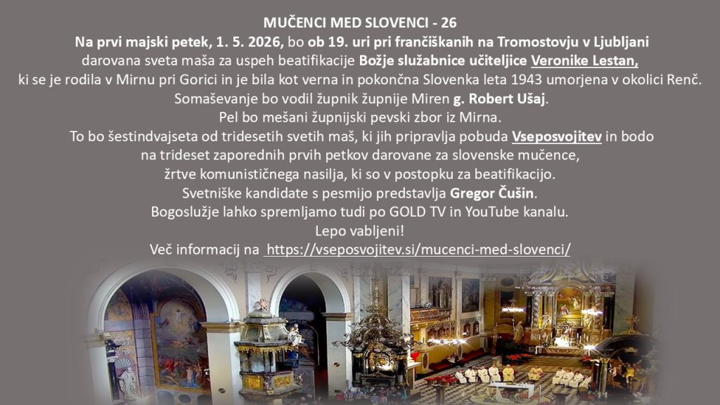 To bo šestindvajseta od tridesetih svetih maš, ki jih pripravlja pobuda Vseposvojitev in so bile ter še bodo na trideset zaporednih prvih petkov darovane za slovenske mučence, žrtve komunističnega nasilja, ki so v postopku za beatifikacijo.
