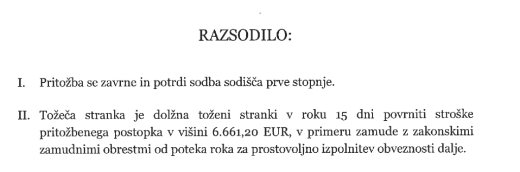 Zahtevek avstrijske družbe je najprej potrdilo novogoriško okrožno sodišče, saj je bilo o tožbenem zahtevku odločeno že s pravnomočno potrditvijo prisilne poravnave, pa tudi zato, ker je zahteva že zastarala. Avstrijska družba se je na sodbo pritožila, a je pritožbo zavrnilo tudi višje sodišče.