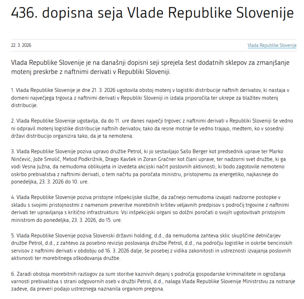 Na 436. dopisni seji je Vlada Republike Slovenije obravnavala težave pri oskrbi z naftnimi derivati in sprejela več nujnih ukrepov. Poleg ukrepov za omejitev točenja goriva in angažiranja vojske vlada preučuje tudi pravne možnosti proti Petrolu.