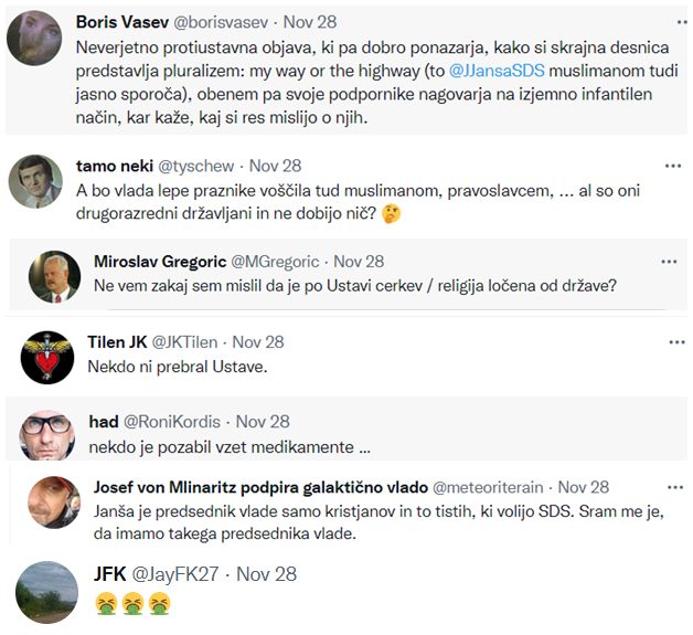Predsednik vlade, ki v težkih razmerah skrbi za blaginjo verujočih kristjanov in neverujočih v naši državi, ob začetku Adventa pošilja vsem lepe želje. Civilizacijske in kulturne manire narekujejo zahvalo. Žal je pa pri nekaterih miselna ožina in intelektualna puščoba tolikšna, da teh želja ne razumejo. V duhu Adventa želim, da bi kdaj vse to doumeli.