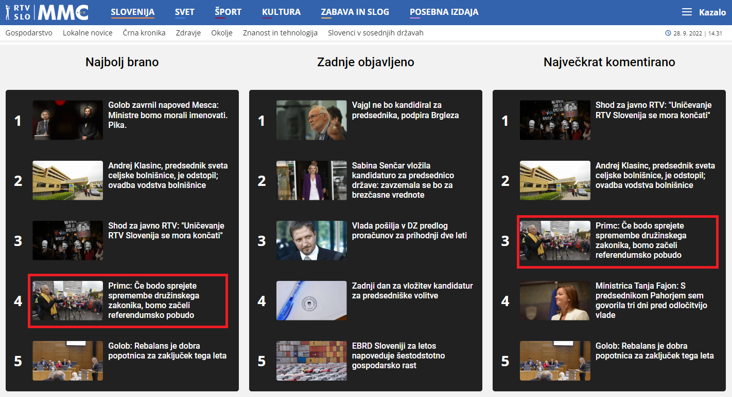 Novica o družinskem shodu na portalu MMC ni bila posebej izpostavljena kot naslovna, danes pa je ni mogoče najti niti na prvi strani novic iz Slovenije – razen pod rubrikama "Najbolj brano" in "Najbolj komentirano" na dnu strani (glej spodaj). Kljub temu torej, da je bila novica neizpostavljena, se je zaradi očitno visokega zanimanja bralstva prebila med najbolj brane.