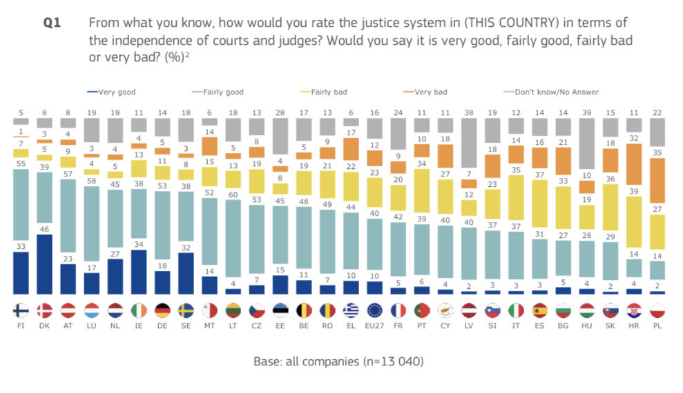Gre sicer za anketo, ki je spraševala splošno javnost. V drugi anketi pa so povprašali tudi podjetja. Med njimi je zgolj 3 % slovensko pravosodje glede neodvisnosti označilo kot zelo dobro (evropsko povprečje 10 %). To sicer ni najmanj, še slabše so pravosodje ocenila latvijska, slovaška in poljska podjetja (2 %).