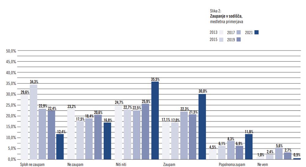 Zaupanje v inštitucije je v Sloveniji od nekdaj problem. Po raziskavi Valicona iz marca letos je zaupanje Slovencev v sodišča negativno (razmerje med zaupam/ne zaupam −23). Bolj kot sodiščem recimo Slovenci zaupajo zdravstvu, NIJZ, trgovskim podjetjem in Evropski komisiji, malo manj pa županom, bankam, javni upravi. Podobno negativno razmerje zaupanja imajo tudi sodniki (−21) in odvetniki (−22)