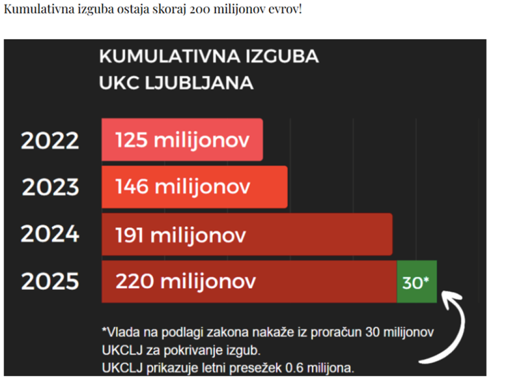 Največja zdravstvena ustanova v državi, Univerzitetni klinični center Ljubljana (UKC), že več let posluje z negativnim izidom. Za leto 2025 je izgubo pokrila država, kumulativni primanjkljaj pa ostaja blizu 200 milijonom evrov. To odpira ključno vprašanje: Ali sistem deluje učinkovito ali pa se izgube zgolj prelagajo v prihodnost?